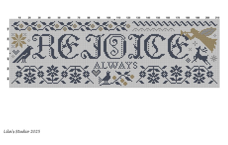 Threads: DMC 610, 317, 3362, 152, 3722, 161, 3822, 612, 732, 3865 or White.